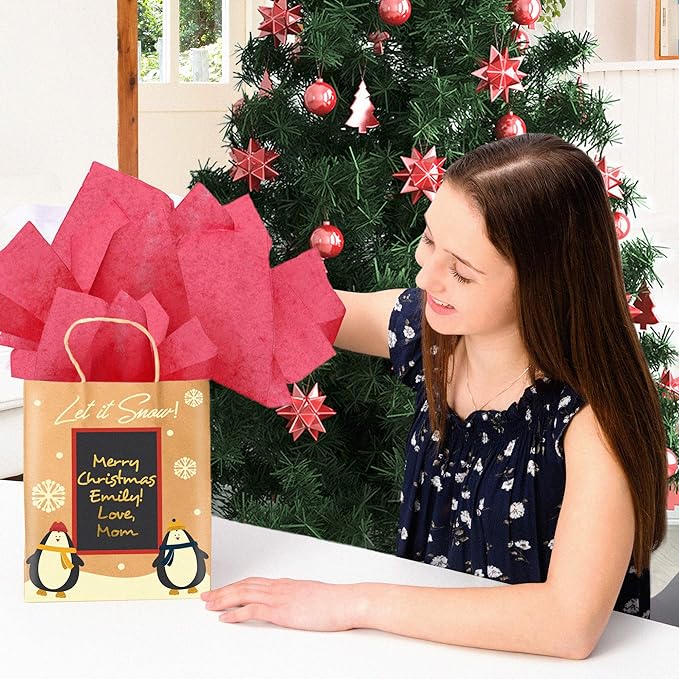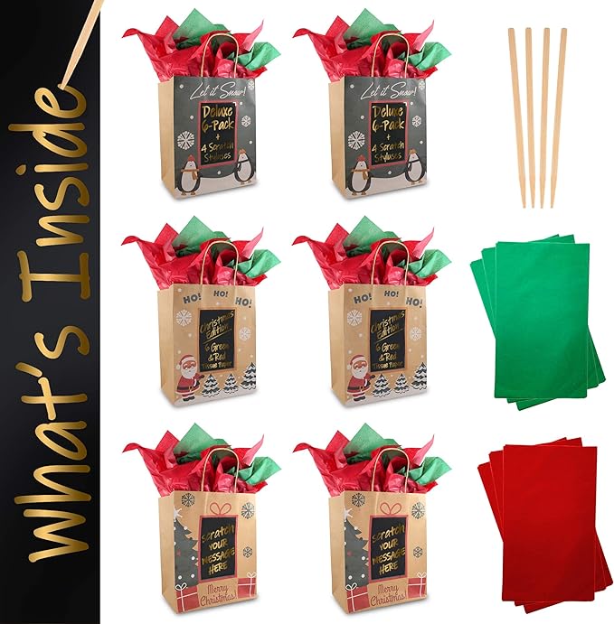 - MAKE GIFT WRAPPING EASY! Holiday Gift bags with handles for easy carrying also come with 4 stylus-style scratchers to scratch your message on to each bag and red and green tissue paper. Everything you need!