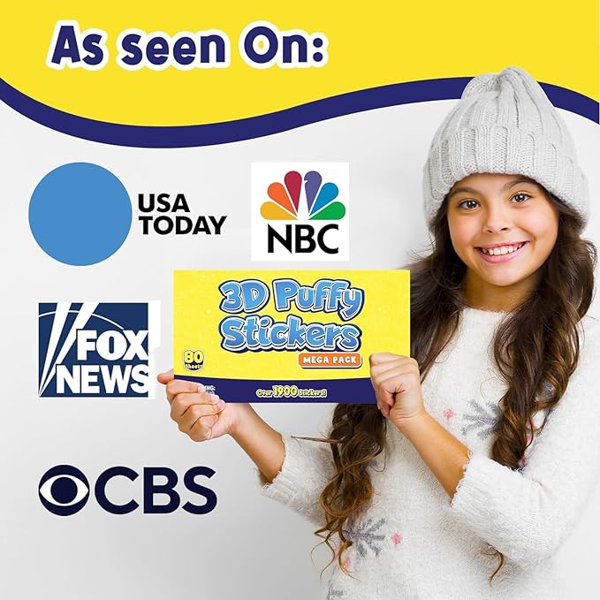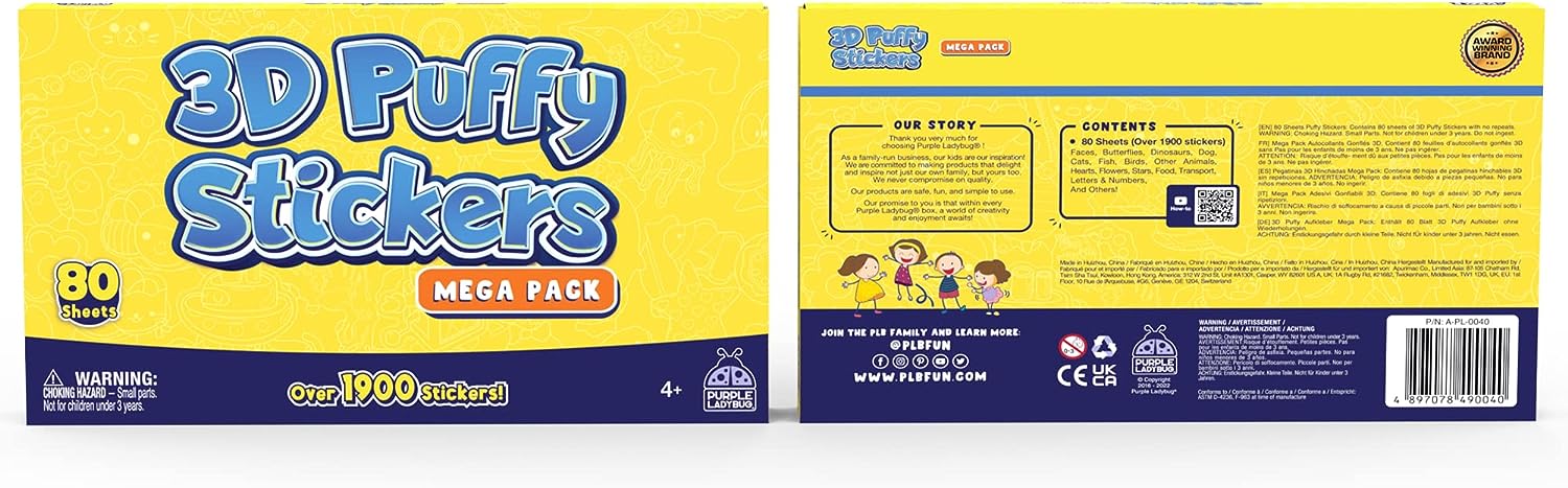 Incredible value! 80 different sheets of 3D Puffy stickers (6.75 inches x 2.75 inches each) with approximately 24 stickers per sheet for a total of about 2000 stickers.