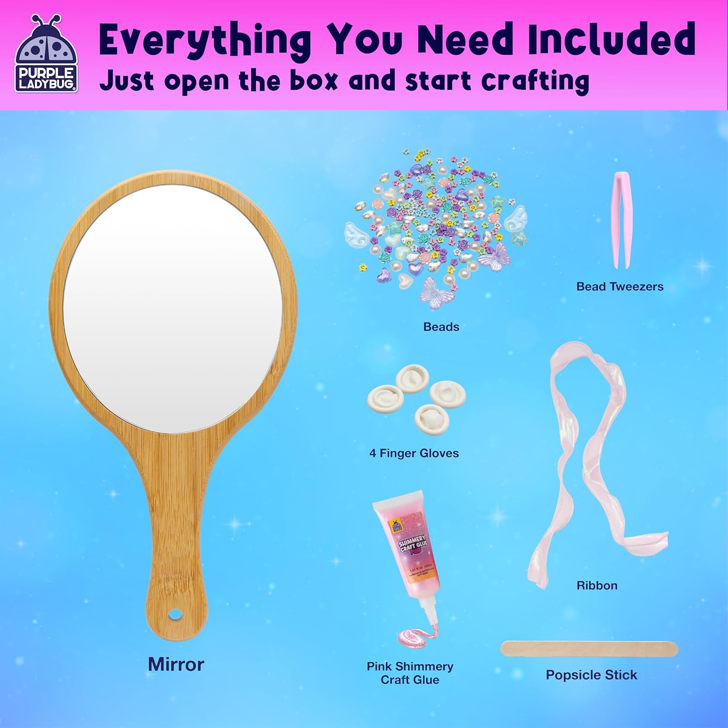 - AN ALL-IN-ONE CRAFT KIT! Everything your kids need is in the box! Each kit includes a wooden mirror, shimmery craft glue, alphabet beads, shiny embellishments, ribbon, finger gloves, tweezers, a craft stick, and a squeeze tip for detailed glue work. The tools are easy to handle, so kids can craft independently with minimal help. No extra supplies needed. Just open the box and start crafting!