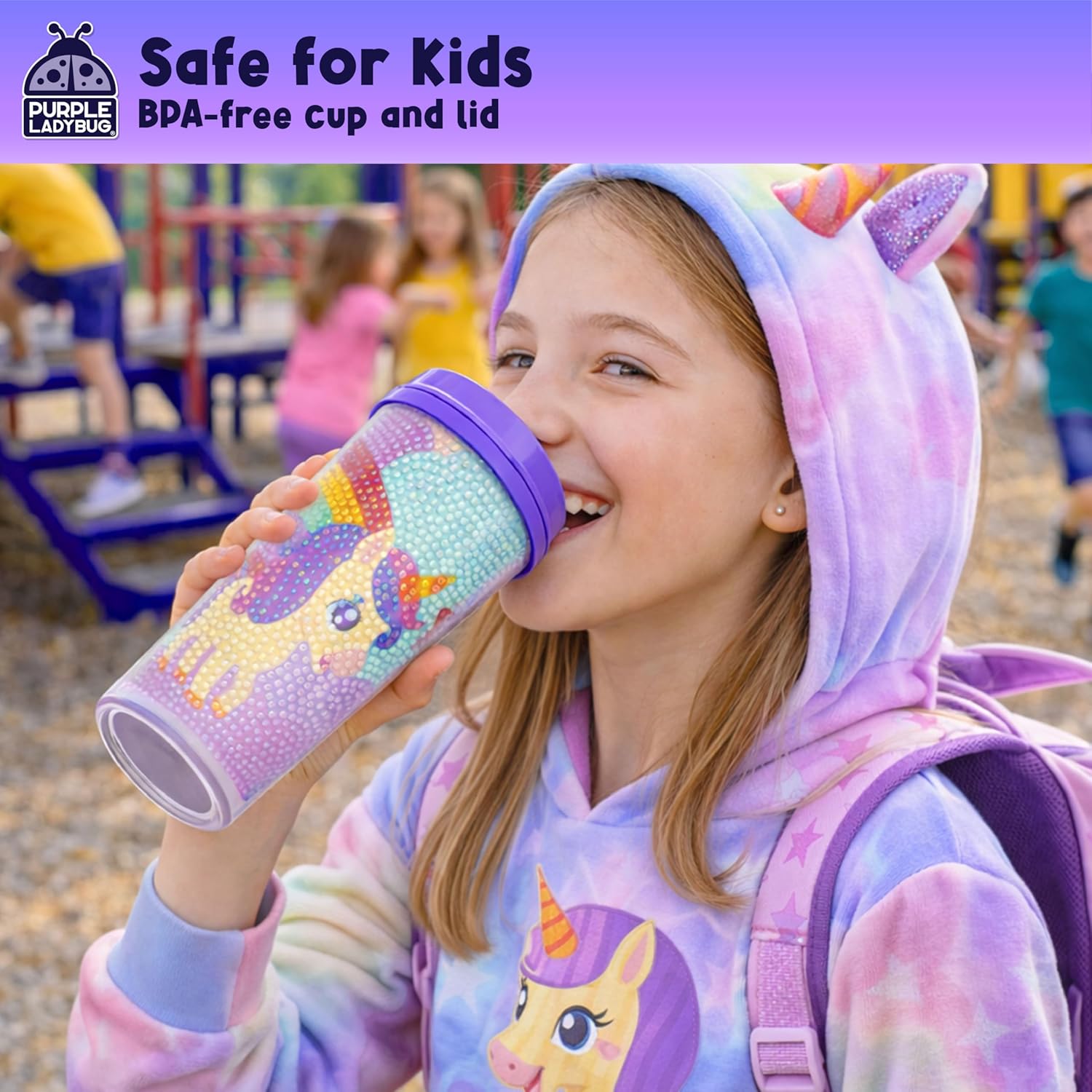 - EVERYTHING YOU NEED INCLUDED! Inside, you’ll find 1 double-walled BPA-free cup with lid, 1 preprinted unicorn design wrap, 17 packs of colored diamonds, 1 diamond art pen, 2 sorting trays, and 1 wax square. Kids can jump straight into creative fun—no extra supplies needed!