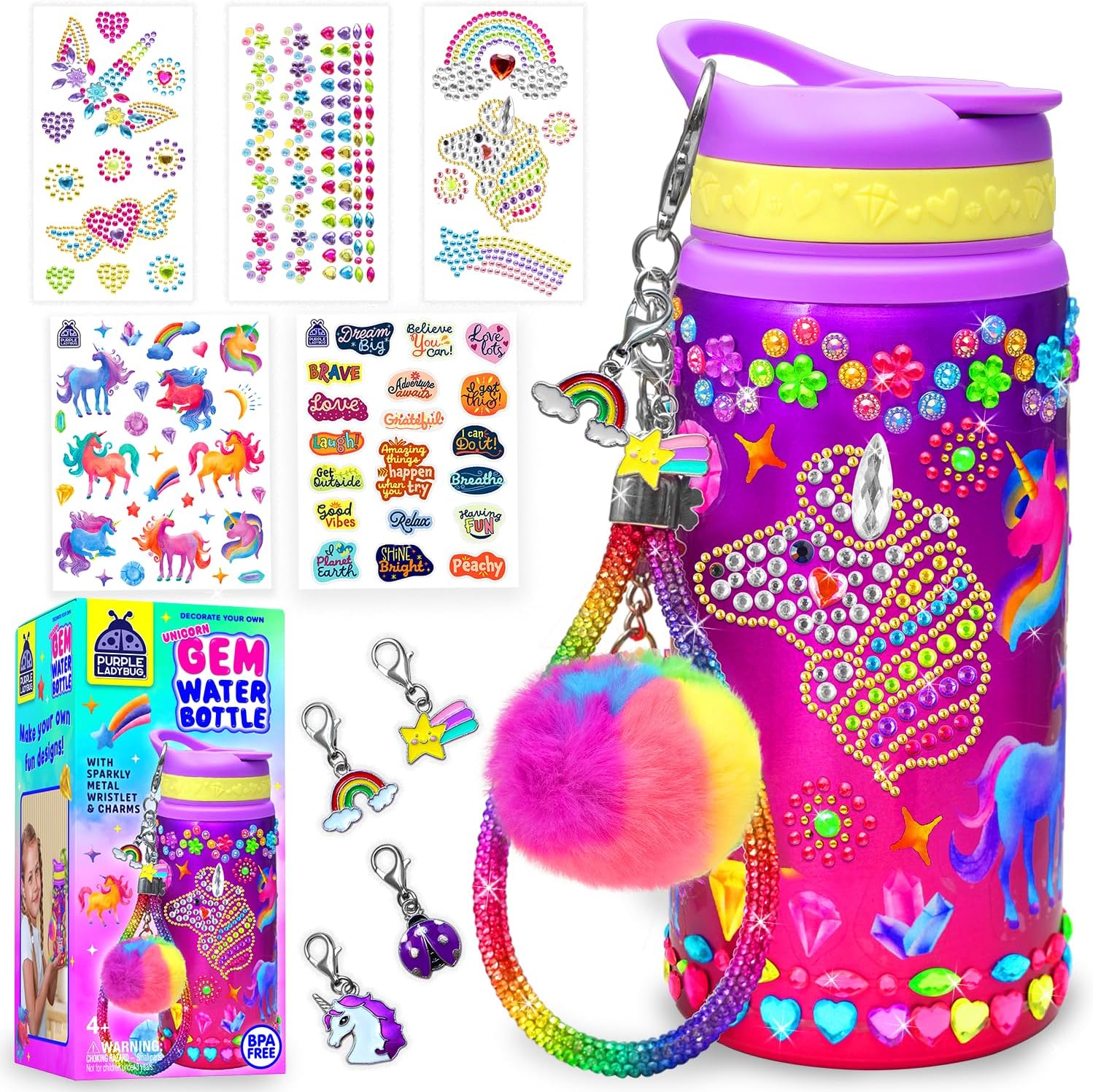 - EVERYTHING YOU NEED INCLUDED AND MORE! This kit includes everything your kids need for a magical crafting experience (plus lots of extra stickers for later!) Inside, you’ll find 1 aluminum water bottle (holds 20oz/591 mL), 4 unicorn-themed charms, 1 pompom charm, 3 gemstone sticker sheets, 2 vinyl sticker sheets, and a sparkly wristlet for easy carrying