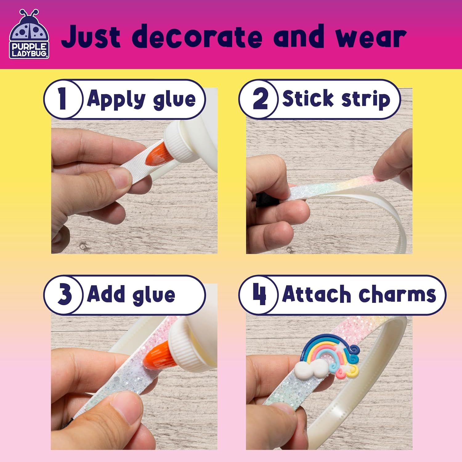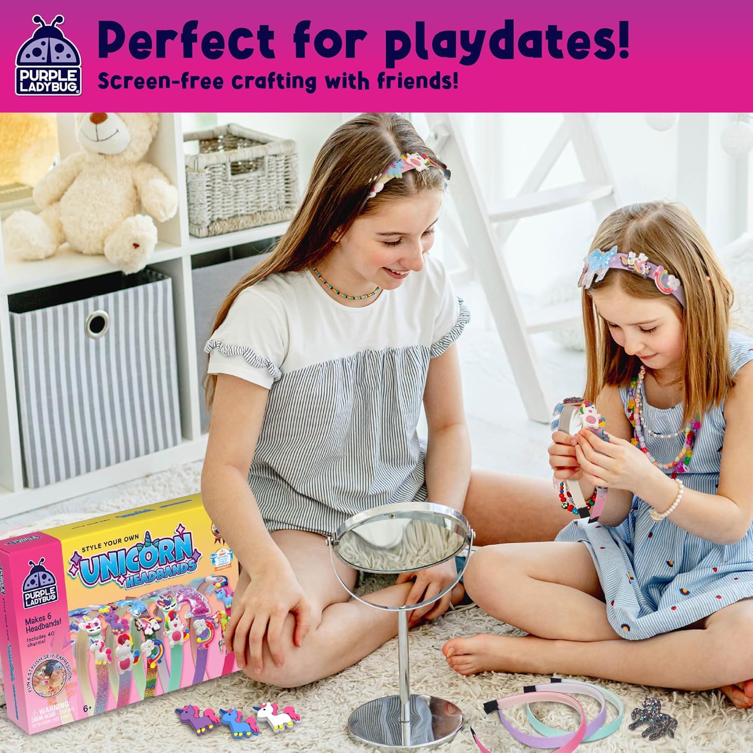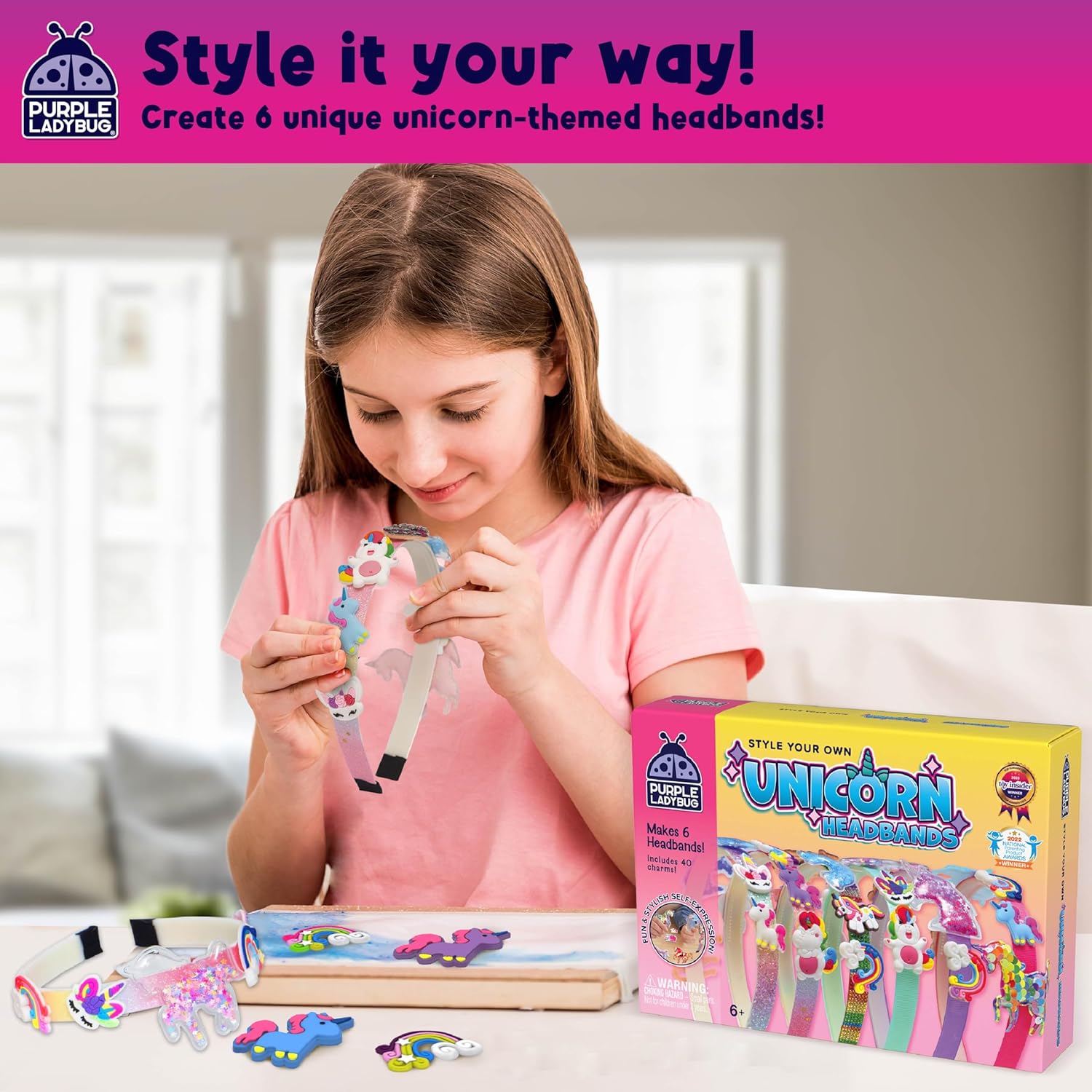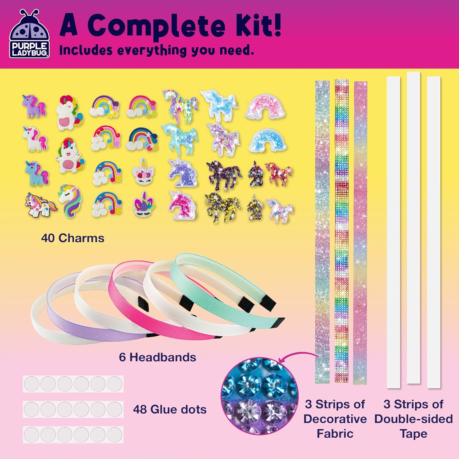 - COMPLETE DIY HEADBAND KIT FOR GIRLS - This unicorn craft kit includes 6 plain headbands, 3 strips of decorative fabric, 29 cute and pretty unicorn charms, 1 glue, and detailed step-by-step instructions to create unique girls headbands.